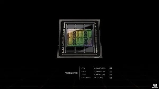 性能方面,FP64/FP32 60TFlops(每秒60万亿次),FP16 2000TFlops(每秒2000万亿次),TF32 1000TFlops(每秒1000万亿次),都三倍于A100,FP8 4000TFlops(每秒4000万亿次),六倍于A100。